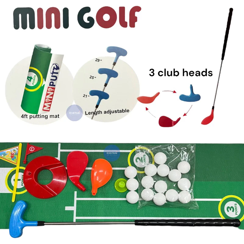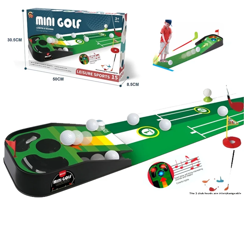 This mini golf mat for children features bright colorful lights and eye-catching visual effects, offering a fun and engaging play experience. Each shot produces cheerful sounds, and the club heads are interchangeable to match different skill levels. The set includes 3 extendable putters to grow with the child, supporting skill development.
