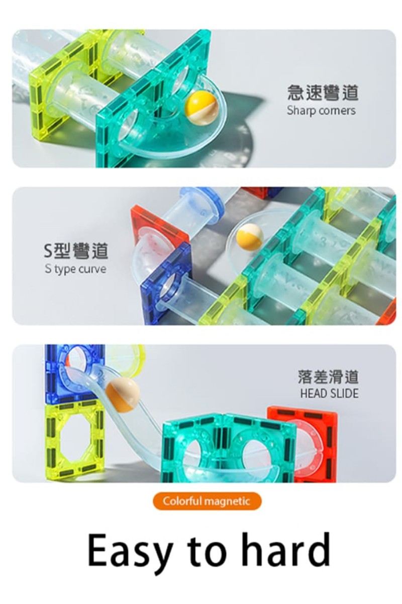• New upgraded design, tiles + marble pipes + colourful balls roll up and down quickly on the track, easy to assemble and disassemble.