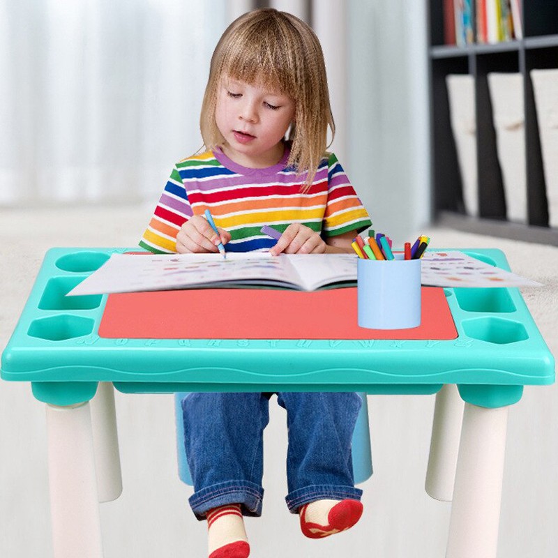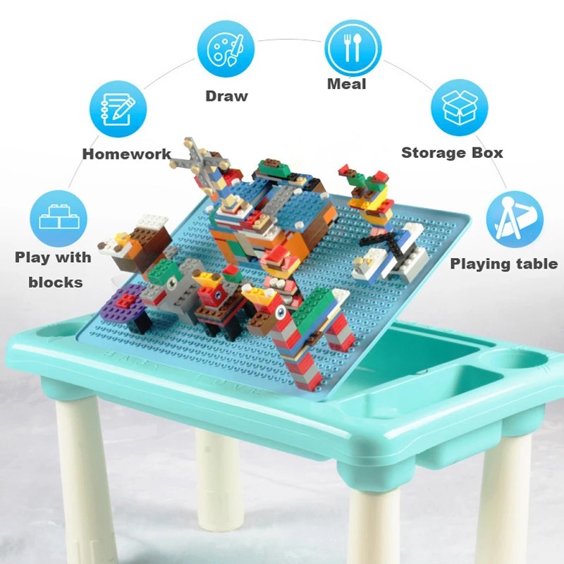 • contains 300 colorful blocks that can be stacked into a storage area located under the table.