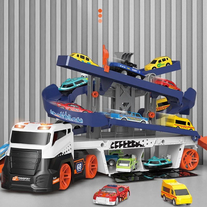 • A special lever on the body, with which you can unload the machines in the right place. Lift it up, two ramps will descend on both sides, and the cars themselves will move down the ramps in different directions