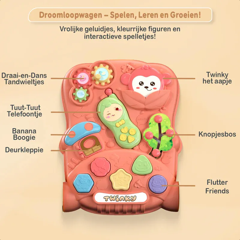 ·         Interactive Play Station: Fun-filled activity panel with 5 buttons, shape sorter, gears, animal buttons, and role-play activities to stimulate learning while playing.