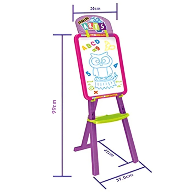 • 3-in-1 double-sided drawing and learning board featuring a white side for wipe-off markers and a black side for chalk, providing children with a versatile creative and educational experience.
