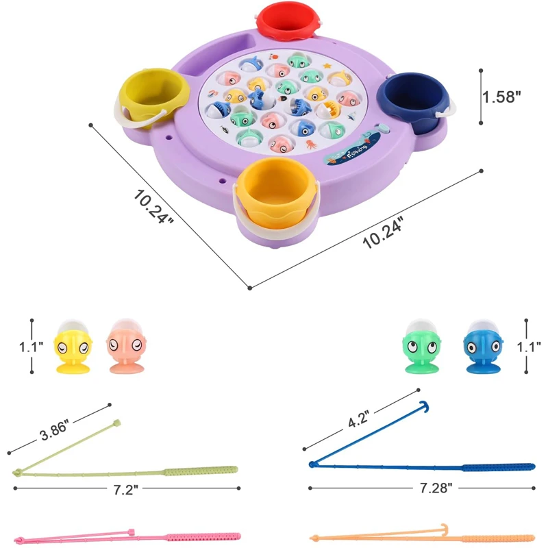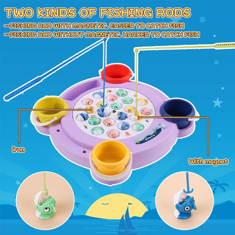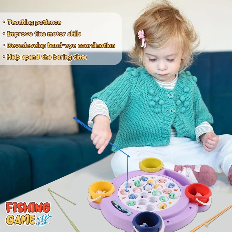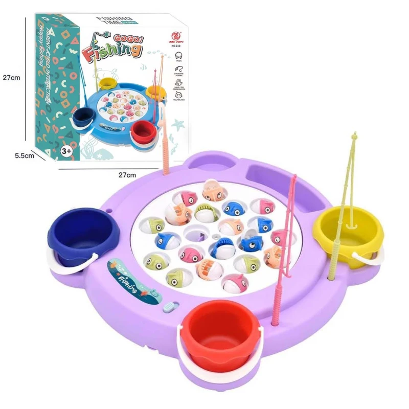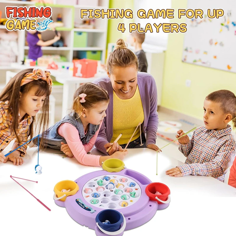 The rotating fishing game offers kids an exciting and interactive experience with a spinning board that mimics a real fish pond. The fish open and close their mouths quickly, adding challenge and fun. The game includes four fishing rods with two different types (magnetic and non-magnetic) to provide multiple difficulty levels. It can be played with or without music, making it perfect for family time and group activities.