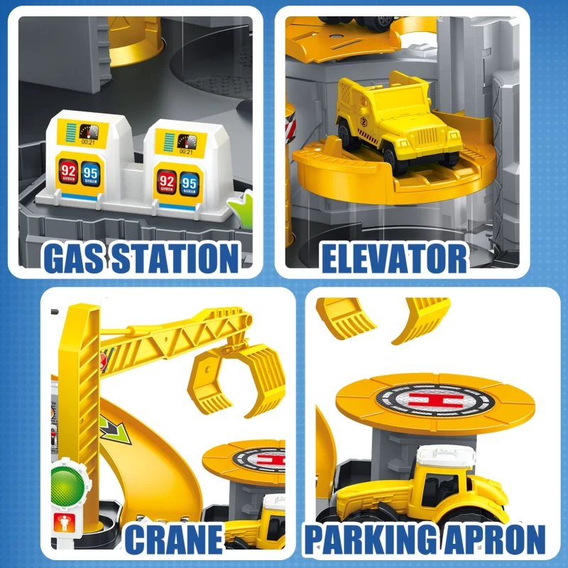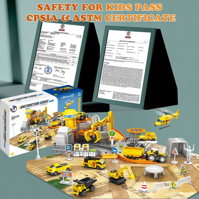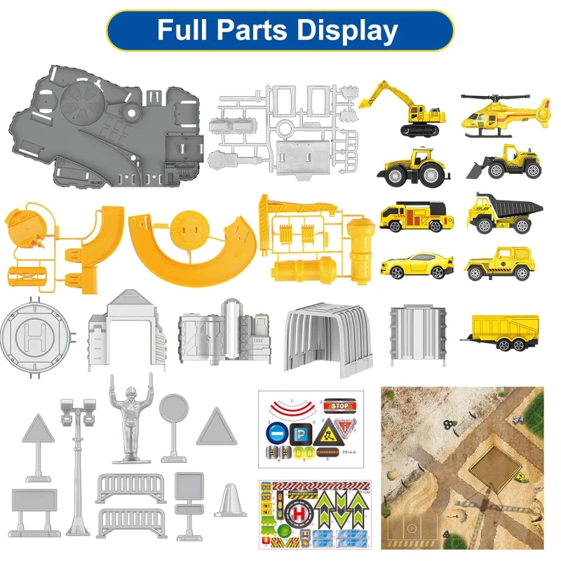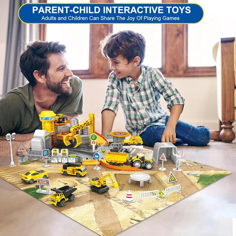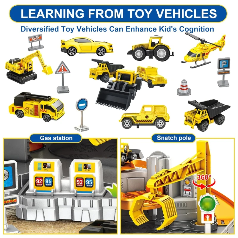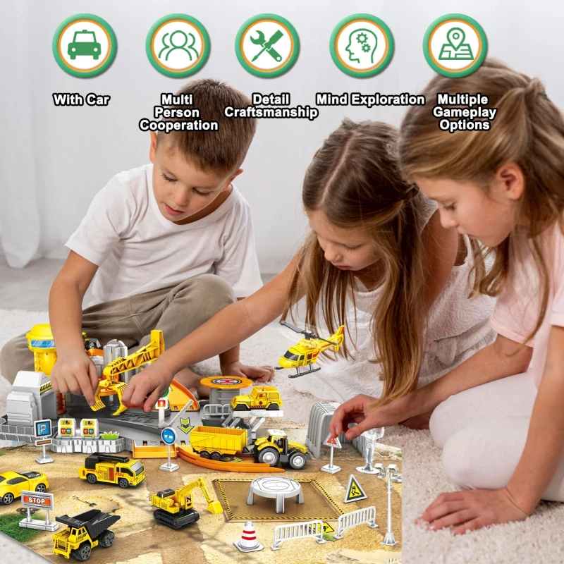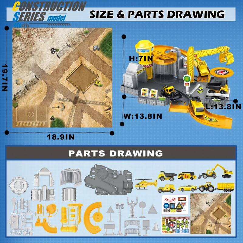Construction Toys Track Set includes excavator, bulldozer, dumper, haul truck, engineering cars, jeep, movable crane, race track, helicopter, map, road signs, builder, and many construction accessories that give boys and girls abundant imaginative play.