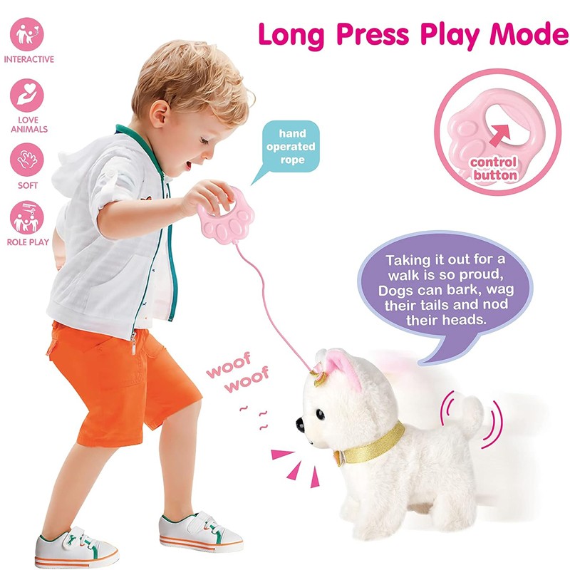 • -Long-press the handle on the pull-wire, the puppy will bark and walk, wag tail and nod head all the time.