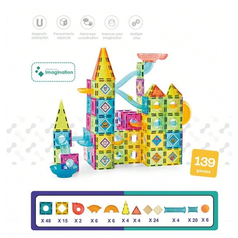 • 139 magnetic colored bricks