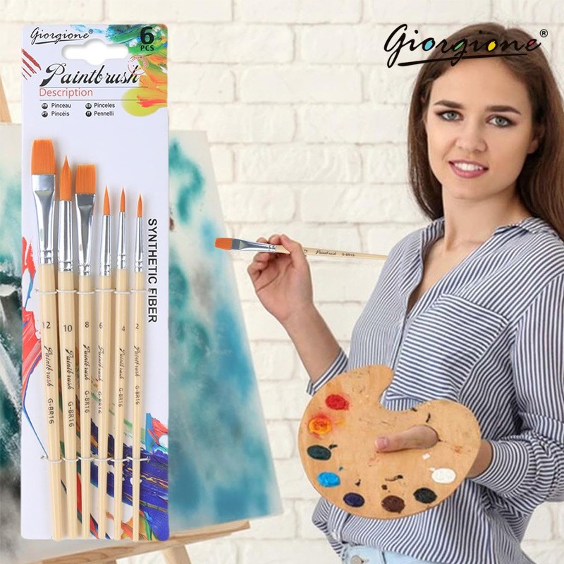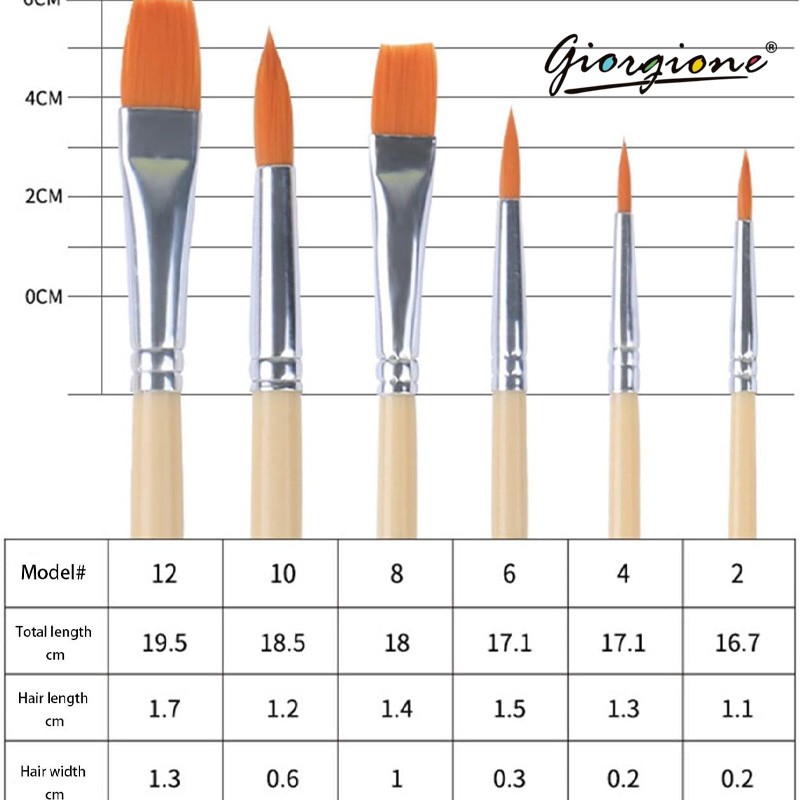 Giorgione Artist Paint Brush Set Of 6 Nylon Bristles Round & Flat Paint Brushes 2-4-6-8-10-12 (G-BR16)