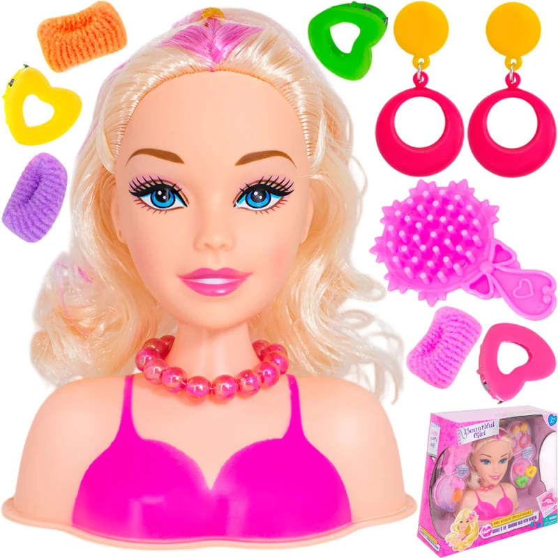The playset includes a beautiful doll head with long, lifelike hair, providing a realistic canvas for hair styling and creative play. Children can use the included comb and accessories to brush, braid, twist, and style the doll's hair in a variety of ways.