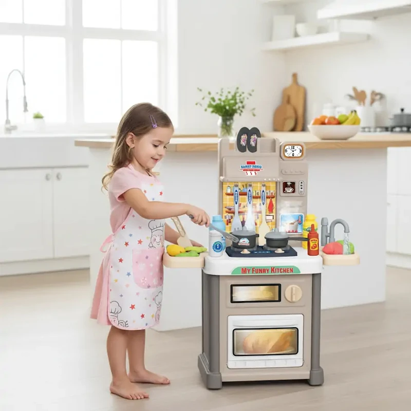 The Kids’ Kitchen is an innovative and modern playset made from high-quality, safe, and non-toxic materials. It is designed to provide your child with a fun and creative play experience. The kitchen features a functional faucet, a variety of kitchen utensils, realistic steam, sound and light functions, which stimulate your child’s senses and develop their imagination, motor skills, and cognitive abilities. Its cute and playful design creates an atmosphere of play, adventure, and learning, making it perfect for hours of creative play. It also makes a wonderful gift for children aged 3 to 7 years.