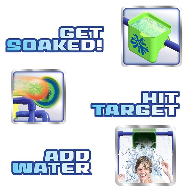• Simply assemble the tower, add water to the bucket and try hitting the target with the aqua Splasher balls.