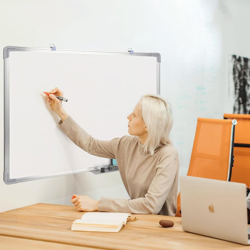 • Crafted with a sleek aluminum frame, this whiteboard is not only durable but also adds a modern aesthetic to any room. It’s designed to withstand daily use while remaining lightweight and easy to mount.