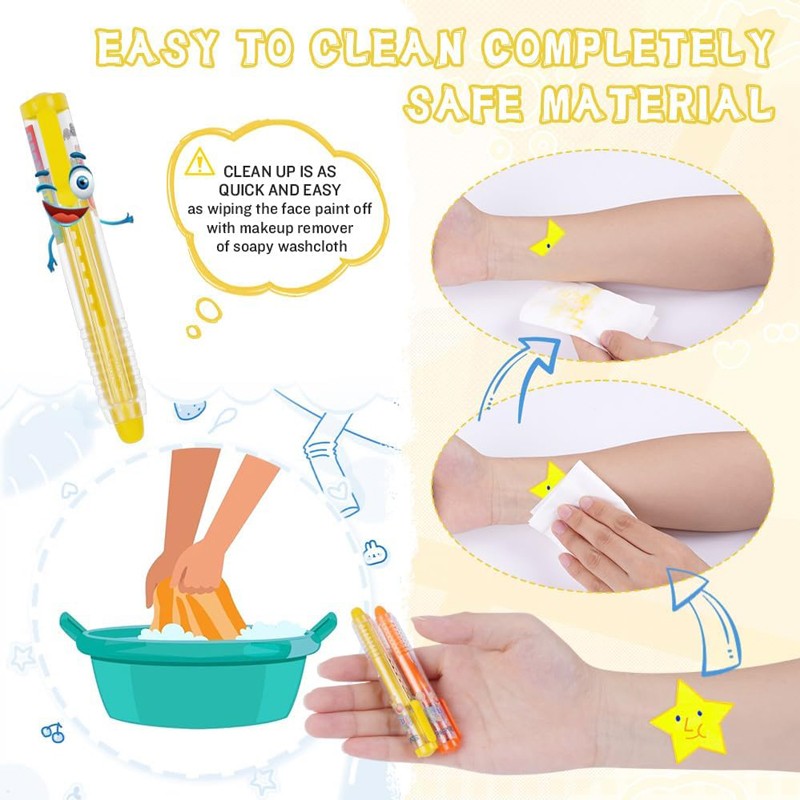 • Our kids face paint kit has a soluble formula so it wipes off easily, just wipe with a paper towel and wash with soap and warm water.