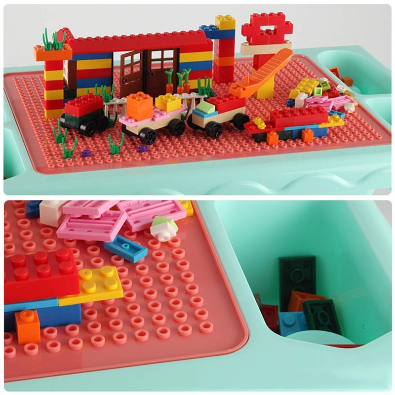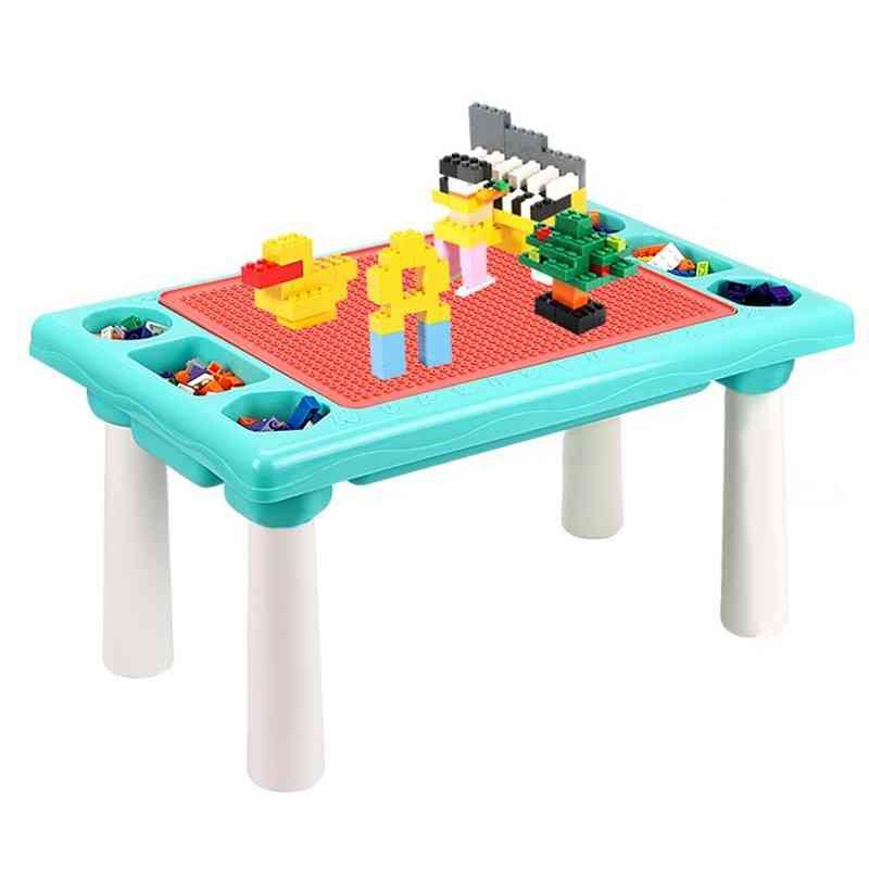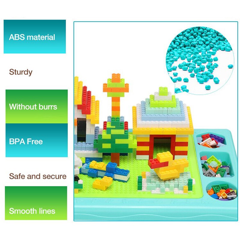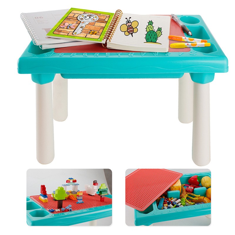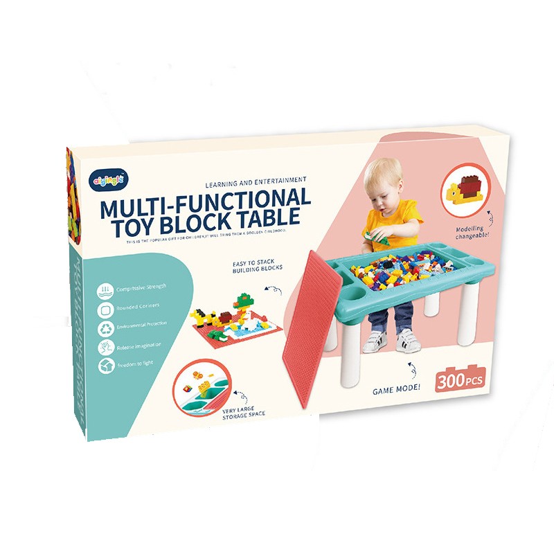 • contains 300 colorful blocks that can be stacked into a storage area located under the table.