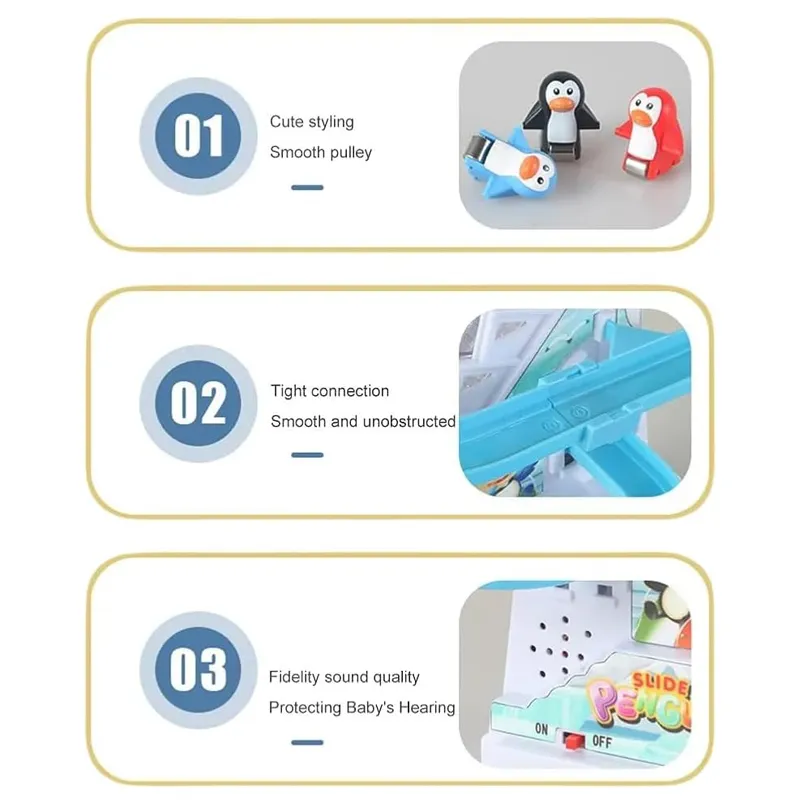 • Number of Penguins:3 moving penguins (blue, black, blue) that climb the stairs and slide down the slope with smooth movement