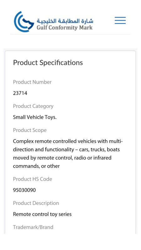 • Product has been tested and certified to meet the quality and safety standards set by the Gulf conformity mark.